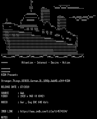 | FiLENAME: | Stranger.Things.S03E01.German.DL.1080p.WebHD.x264-AIDA.mkv |