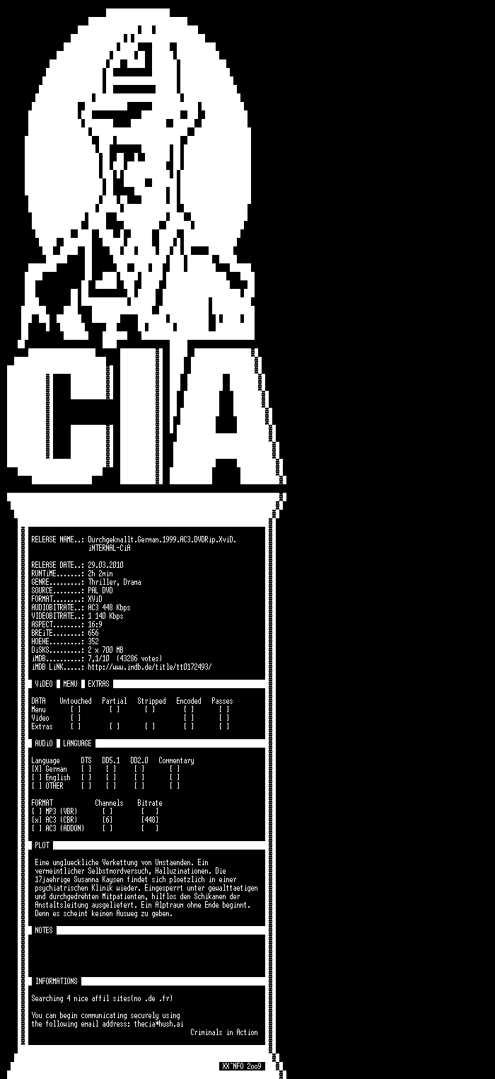 | FiLENAME: | Durchgeknallt.German.1999.AC3.DVDRip.XviD.iNTERNAL-CiA.CD1.avi |