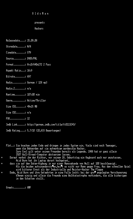 | FiLENAME: | Hackers.GERMAN.1995.DVDRiP.XViD.iNTERNAL-OldsMan.avi |