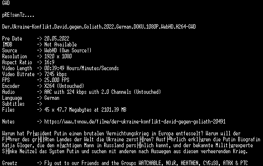 | FiLENAME: | Der.Ukraine-Konflikt.David.gegen.Goliath.2022.German.DOKU.1080P.WebHD.H264-GWD.mkv |