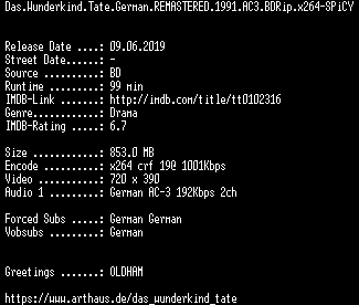 | FiLENAME: | Das.Wunderkind.Tate.German.REMASTERED.1991.AC3.BDRip.x264-SPiCY.mkv |