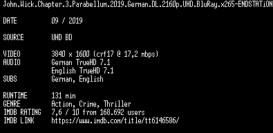 | FiLENAME: | John.Wick.Chapter.3.Parabellum.2019.German.DL.2160p.UHD.BluRay.x265-ENDSTATiON.mkv |