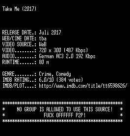 | FiLENAME: | Take.Me.2017.German.WebRip.x264-SLG.mkv |