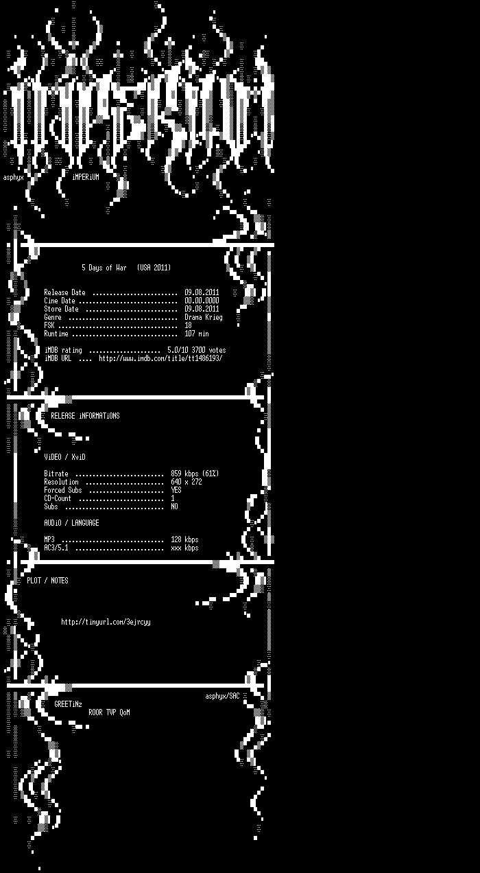 | FiLENAME: | 5.Days.of.War.German.2011.DVDRip.XviD-iMPERiUM.avi |