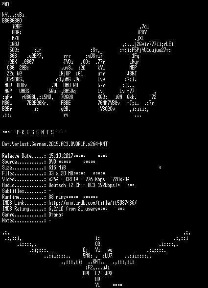 | FiLENAME: | Der.Verlust.German.2015.AC3.DVDRiP.x264-KNT.mkv |
