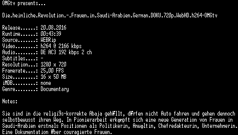 | FiLENAME: | Die.heimliche.Revolution.-.Frauen.in.Saudi-Arabien.German.DOKU.720p.WebHD.h264-OMGtv.mkv |