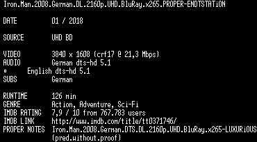 | FiLENAME: | Iron.Man.2008.German.DL.2160p.UHD.BluRay.x265.PROPER-ENDTSTATiON.mkv |