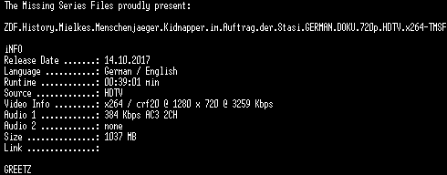 | FiLENAME: | ZDF.History.Mielkes.Menschenjaeger.Kidnapper.im.Auftrag.der.Stasi.GERMAN.DOKU.720p.HDTV.x264-TMSF.mkv |