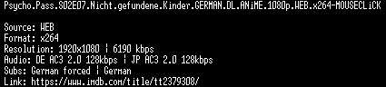 | FiLENAME: | Psycho.Pass.S02E07.Nicht.gefundene.Kinder.GERMAN.DL.ANiME.1080p.WEB.x264-MOUSECLiCK.mkv |