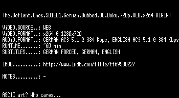 | FiLENAME: | The.Defiant.Ones.S01E01.German.Dubbed.DL.Doku.720p.WEB.x264-BiGiNT.mkv |