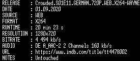 | FiLENAME: | Crowded.S01E11.GERMAN.720P.WEB.X264-WAYNE.mkv |