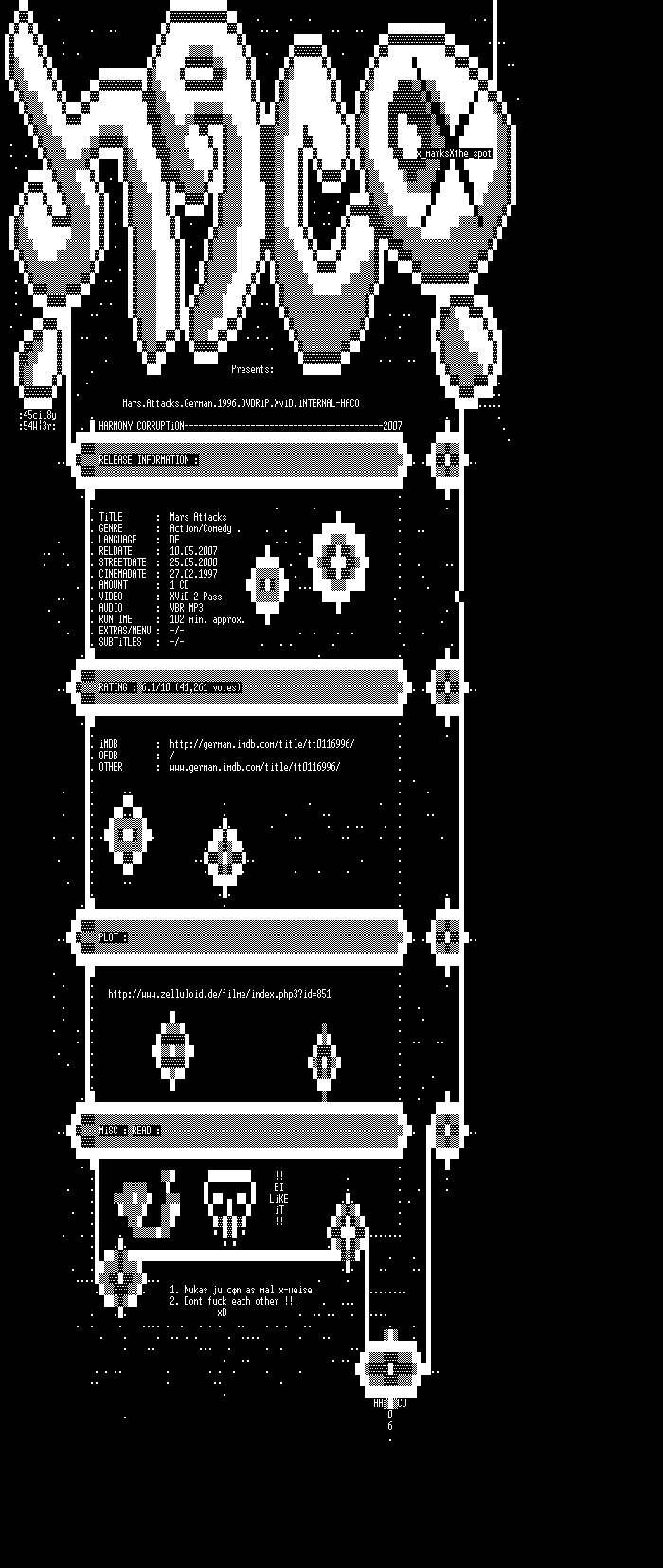 | FiLENAME: | Mars.Attacks.German.1996.DVDRiP.XviD.iNTERNAL-HACO.avi |