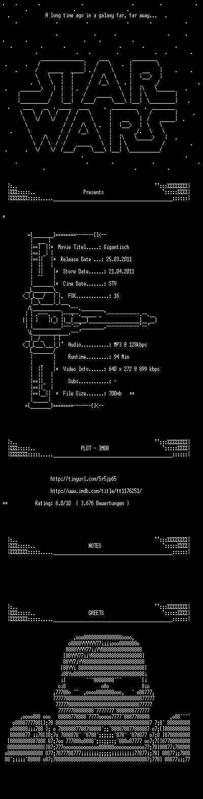 | FiLENAME: | Gigantisch.German.2008.DVDRip.XviD-StarWars.avi |