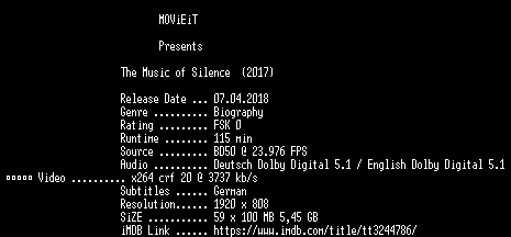| FiLENAME: | The.Music.of.Silence.2017.German.DL.1080p.BluRay.x264-MOViEiT.mkv |