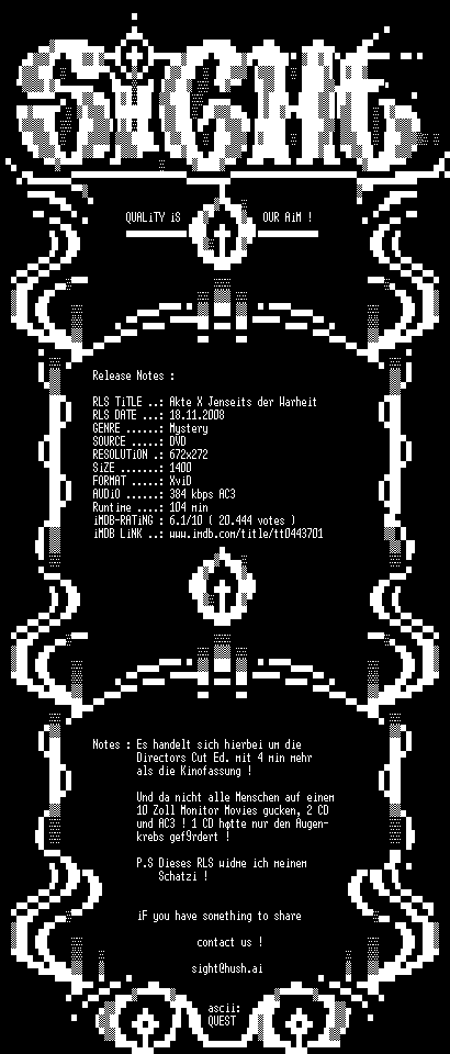 | FiLENAME: | Akte.X.Jenseits.der.Wahrheit.German.2008.DVDRip.XViD-SiGHT.CD1.avi |