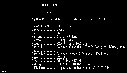 | FiLENAME: | My.Own.Private.Idaho.Das.Ende.der.Unschuld.German.1991.AC3.BDRip.x264-HUNTEDONES.mkv |