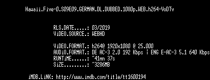 | FiLENAME: | Hawaii.Five-0.S09E09.GERMAN.DL.DUBBED.1080p.WEB.h264-VoDTv.mkv |