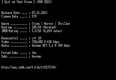 | FiLENAME: | I.Spit.on.Your.Grave.2.UNRATED.German.2013.BDRiP.x264-EXQUiSiTE.mkv |