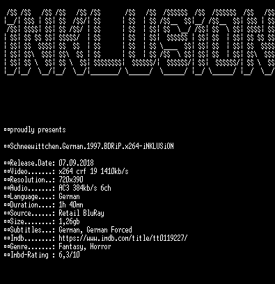 | FiLENAME: | Schneewittchen.German.1997.BDRiP.x264-iNKLUSiON.mkv |