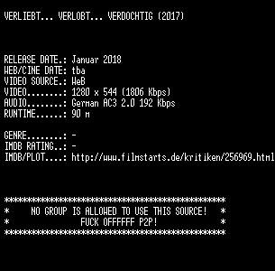 | FiLENAME: | Verliebt.Verlobt.Verdaechtig.2017.German.720p.WebHD.x264-SLG.mkv |