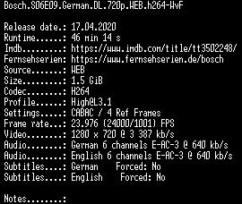 | FiLENAME: | Bosch.S06E09.German.DL.720p.WEB.h264-WvF.mkv |