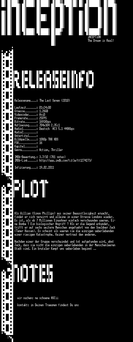 | FiLENAME: | The.Last.Seven.2010.German.AC3.HDRip.XviD-iNCEPTiON.avi |