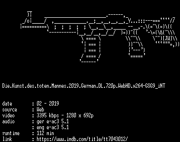 | FiLENAME: | Die.Kunst.des.toten.Mannes.2019.German.DL.720p.WebHD.x264-GSG9_iNT.mkv |