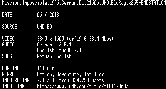 | FiLENAME: | Mission.Impossible.1996.German.DL.2160p.UHD.BluRay.x265-ENDSTATiON.mkv |