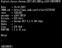 | FiLENAME: | Bigfoot.Junior.German.2017.AC3.BDRip.x264-CHECKMATE.mkv |