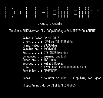 | FiLENAME: | The.Safe.2017.German.DL.1080p.BluRay.x264.RERIP-DOUCEMENT.mkv |