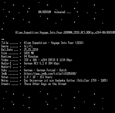 | FiLENAME: | Alien.Expedition.Voyage.Into.Fear.GERMAN.2018.AC3.BDRip.x264-UNiVERSUM.mkv |