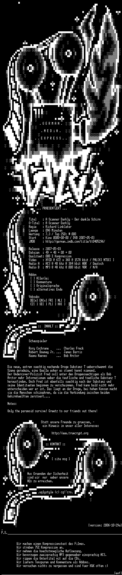 | FiLENAME: | A.Scanner.Darkly.Der.Dunkle.Schirm.2005.XVID-DVDRIP-GERMAN-GME2000.CD2.avi |
