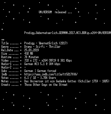 | FiLENAME: | Prodigy.Uebernatuerlich.GERMAN.2017.AC3.BDRip.x264-UNiVERSUM.mkv |