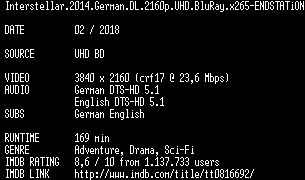 | FiLENAME: | Interstellar.2014.German.DL.2160p.UHD.BluRay.x265-ENDSTATiON.mkv |