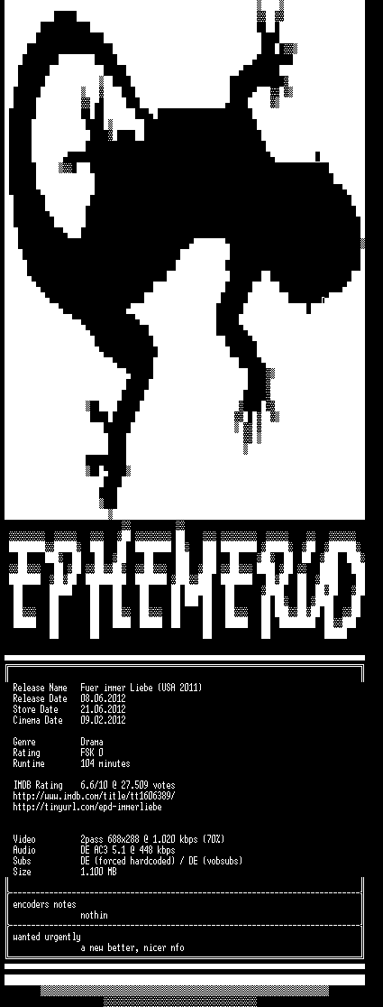 | FiLENAME: | Fuer.immer.Liebe.German.AC3.BDRip.XviD-EPHEMERiD.avi |