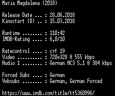 | FiLENAME: | Maria.Magdalena.German.2018.AC3.BDRip.x264-COiNCiDENCE.mkv |