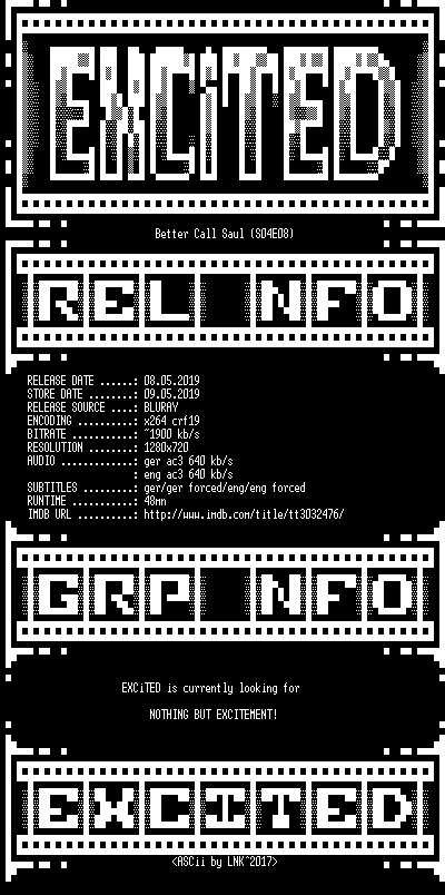 | FiLENAME: | Better.Call.Saul.S04E08.German.DL.720p.BluRay.x264-EXCiTED.mkv |