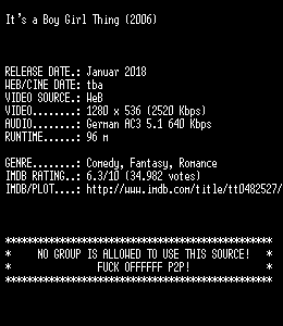 | FiLENAME: | Its.a.Boy.Girl.Thing.2006.German.720p.WebHD.x264-SLG.mkv |
