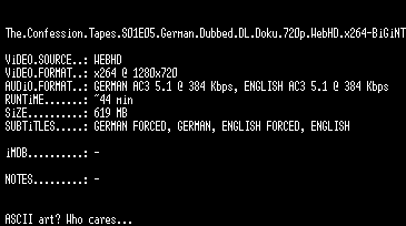 | FiLENAME: | The.Confession.Tapes.S01E05.German.Dubbed.DL.Doku.720p.WebHD.x264-BiGiNT.mkv |