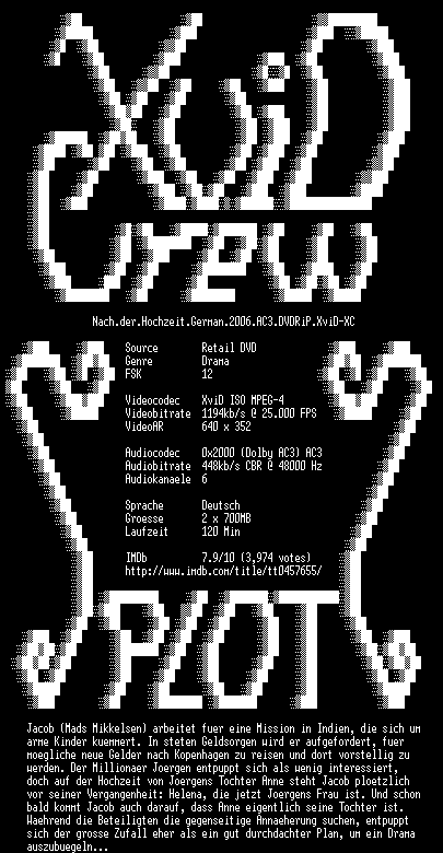 | FiLENAME: | Nach der Hochzeit (2006) [GER-AC3 WS DVD] CD1.avi |