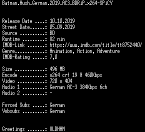 | FiLENAME: | Batman.Hush.German.2019.AC3.BDRiP.x264-SPiCY.mkv |