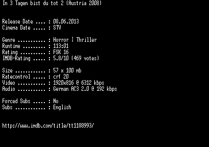 | FiLENAME: | In.3.Tagen.bist.du.tot.2.2008.German.1080p.BluRay.x264-EXQUiSiTE.mkv |
