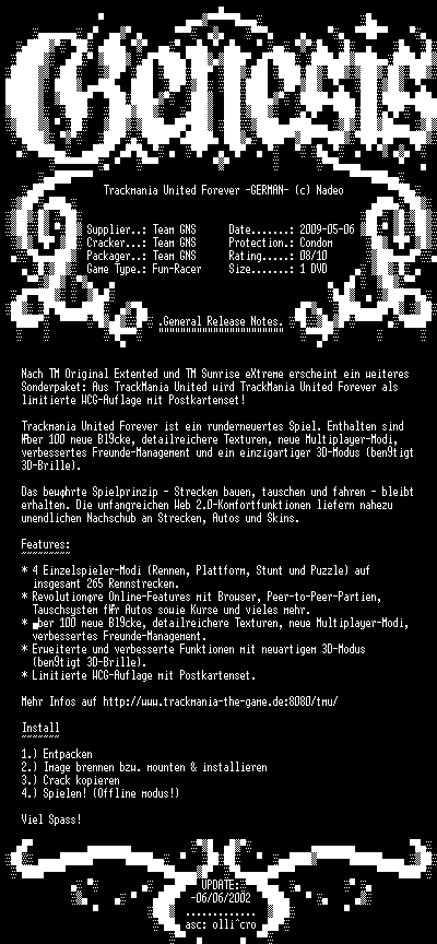 | FiLENAME: | Trackmania.United.Forever.GERMAN-GENESIS.iso |