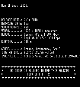 | FiLENAME: | How.It.Ends.2018.German.DL.1080p.WebHD.x264.iNTERNAL-SLG.mkv |