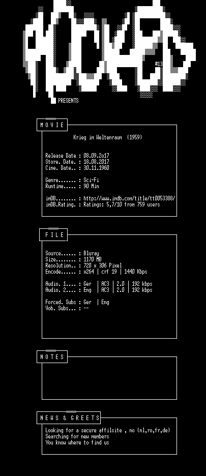 | FiLENAME: | Krieg.im.Weltenraum.German.1959.DL.BDRiP.x264-R0CKED.mkv |