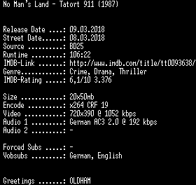 | FiLENAME: | No.Mans.Land.Tatort.911.German.REMASTERED.1987.AC3.BDRip.x264-SPiCY.mkv |