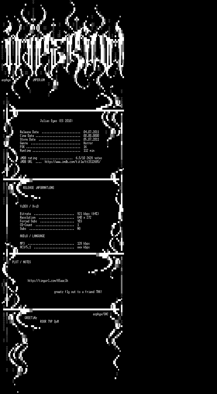 | FiLENAME: | Julias.Eyes.German.2010.DVDRip.XviD-iMPERiUM.avi |