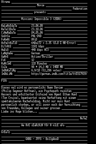 | FiLENAME: | Mission.Impossible.3.German.2006.AC3.DVDRiP.iNTERNAL.XViD-XMF.CD2.avi |