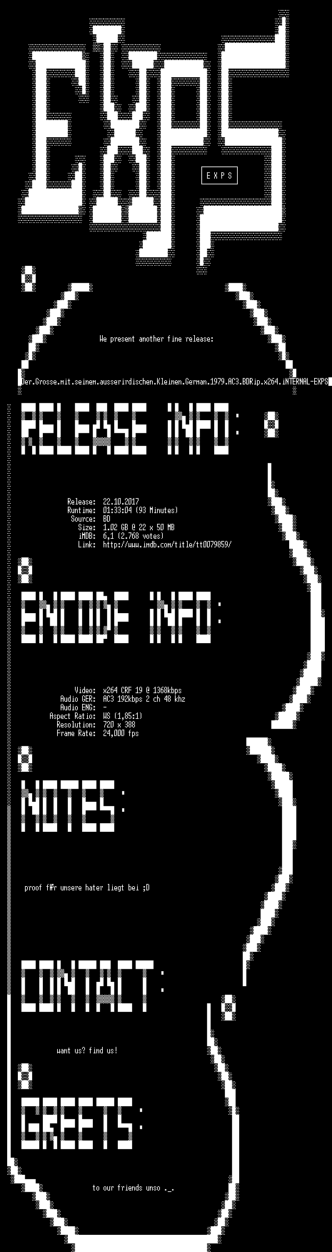 | FiLENAME: | Der.Grosse.mit.seinem.ausserirdischen.Kleinen.German.1979.AC3.BDRip.x264.iNTERNAL-EXPS.mkv |