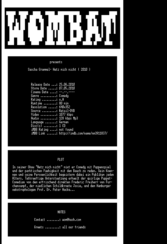 | FiLENAME: | Sascha.Grammel.Hetz.mich.nicht.German.2010.DVDRiP.XViD-WOMBAT.avi |